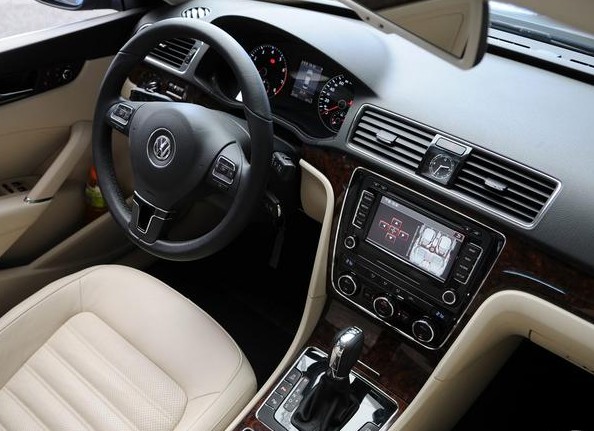 新帕薩特采用了全黑和雙色兩種配色方案,全黑內(nèi)飾更偏重于運(yùn)動(dòng)風(fēng)格,而雙色內(nèi)飾則更偏重商務(wù)。內(nèi)飾用料上采用了真皮、仿木和金屬三種質(zhì)感的材質(zhì),整體做工水平較高。方向盤采用了全黑真皮包裹的三輻設(shè)計(jì),手感不錯(cuò),并配有多功能按鍵,可控制音響和免提電話以及行車電腦的菜單操作。而定速巡航功能的操作則設(shè)計(jì)在了方向盤后方左邊的操縱桿上。燈光的控制旋鈕依舊位于左側(cè)空調(diào)出風(fēng)口下方,前大燈可感應(yīng)外部光線自動(dòng)點(diǎn)亮或關(guān)閉。新帕薩特的儀表盤采用白字+紅色指針的搭配,沒有多余的點(diǎn)綴,顯示清晰明了。在轉(zhuǎn)速表和時(shí)速表的中間,配有一個(gè)3.5英寸行車電腦顯示屏。
