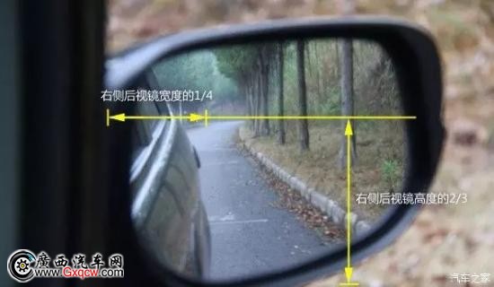使右側(cè)車身映像占據(jù)鏡子左側(cè)的四分之一區(qū)域。遠(yuǎn)處的地平線位于鏡子的中央。