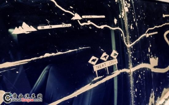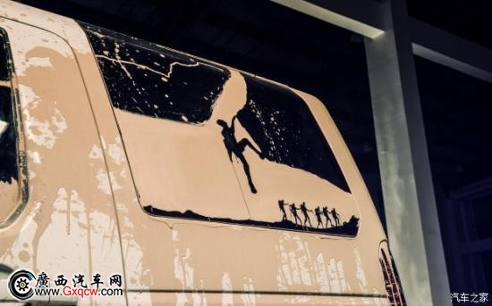 一 位攀登者的形象被繪于車身左側(cè)后舷窗,在他的身后已佇立著無(wú)數(shù)座高峰,而攀登者依舊繼續(xù)不斷向新的高度進(jìn)發(fā),象征著路虎第四代發(fā)現(xiàn)不斷超越自己,登頂座座 山峰的探險(xiǎn)精神。畫面上還特別標(biāo)注了幾座對(duì)第四代發(fā)現(xiàn)而言有著特殊意義的山峰,如海拔4,100米的駝峰與4,023米的天山山脈,像一個(gè)個(gè)榮耀的勛章引 人去回顧曾經(jīng)的征途。而右面車窗上則如一張?zhí)诫U(xiǎn)者手中的地圖,上面繪著巖石遍布的崎嶇之地,冰雪漫天的苦寒之所,黃沙漫漫的荒蕪沙漠和車轍遍布的泥澤地 帶。這些平時(shí)人跡罕至的地方,正是探險(xiǎn)者的樂(lè)園,畫面上一串淺淺的腳印貫穿期間,象征第四代發(fā)現(xiàn)對(duì)這類艱苦地形的征服,他就像一個(gè)忠實(shí)的伙伴隨著勇者一路 前行。移步車的后方,后擋風(fēng)玻璃上,一位手持望遠(yuǎn)鏡的探險(xiǎn)家正凝視前方,背對(duì)坦途,探索未知,他是發(fā)現(xiàn)精神的實(shí)體表現(xiàn)。正是這種精神,讓多少人堅(jiān)定夢(mèng)想, 不斷發(fā)現(xiàn),一往無(wú)前。